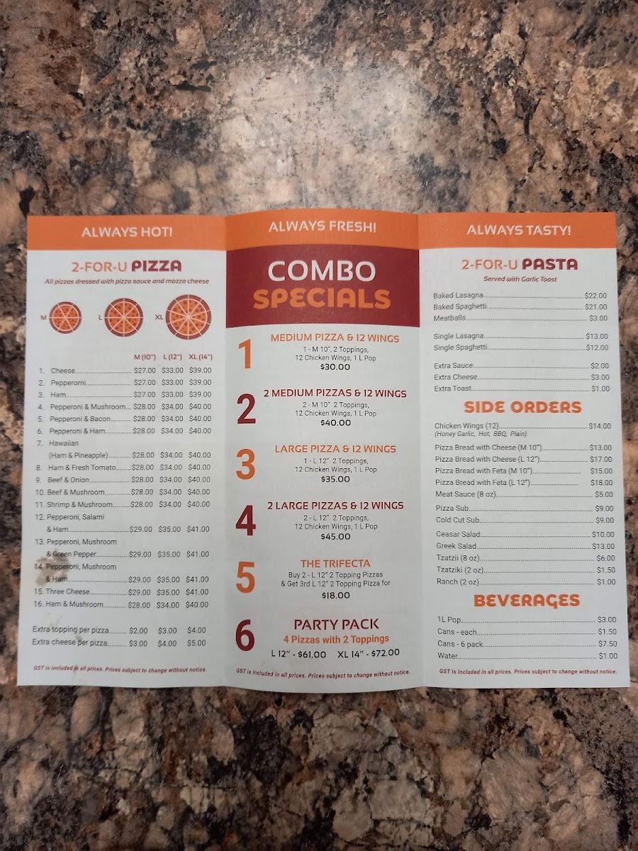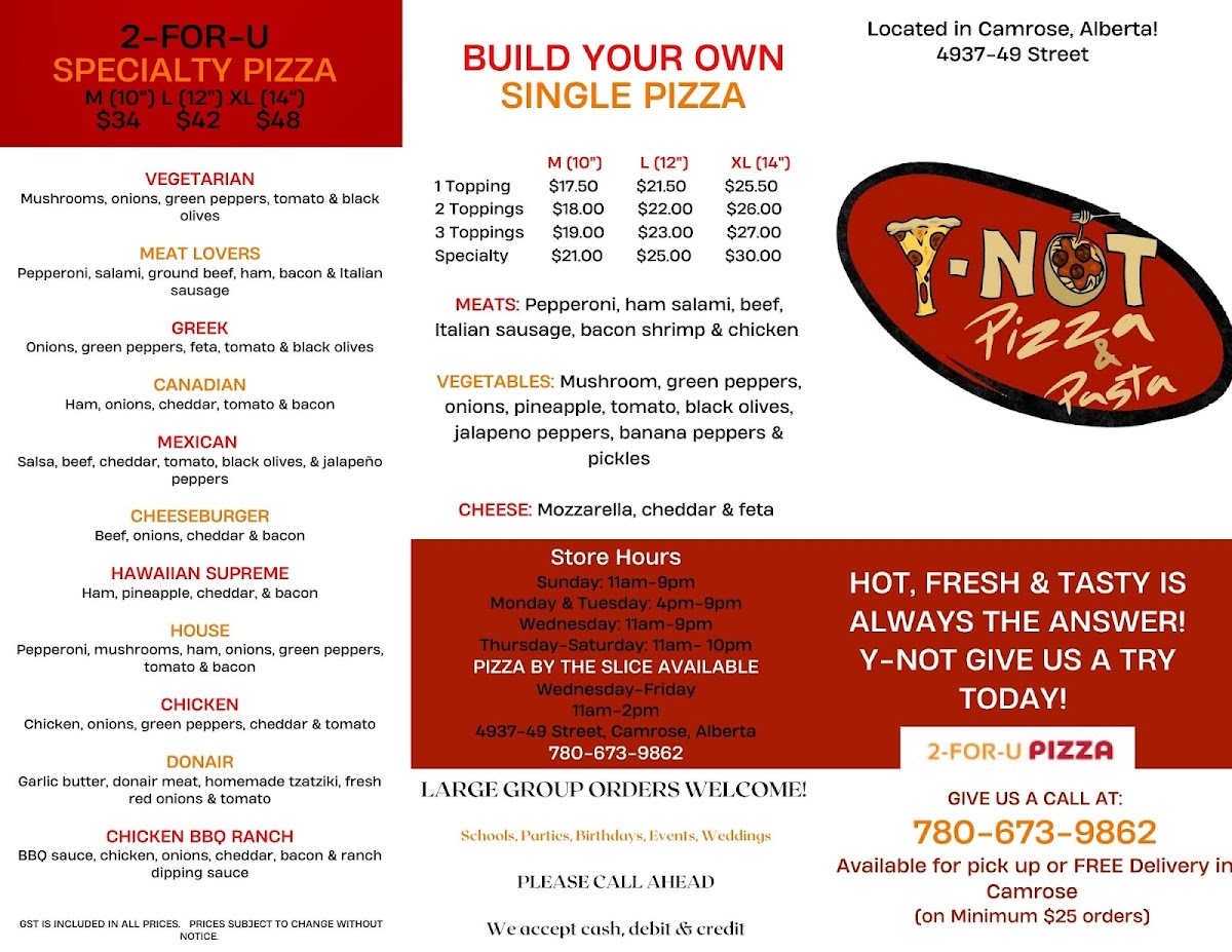 Y-NOT PIZZA & PASTA LTD. Menu
